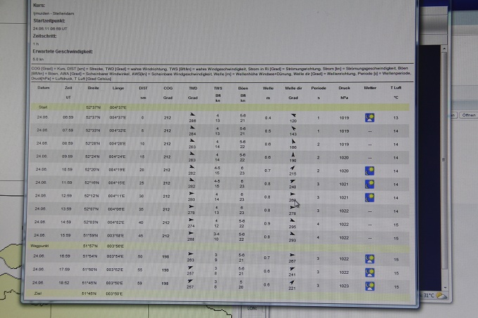 Der Streckenbericht ermittelt für jede Stunde bei vorgegebener Geschwindigkeit das an dem Ort zu erwartende Wetter sowie einige Zusatzinformationen, z. B. Welle und Richtung.