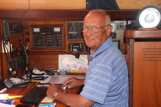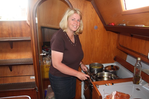 Nach dem Mittagessen beantwortet Elvi ihre emails und Dirk ruht sich vom Essen im Cockpit wohlverdient bei einem Glas Wein aus.