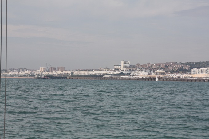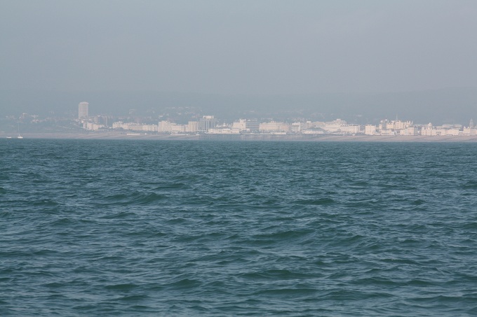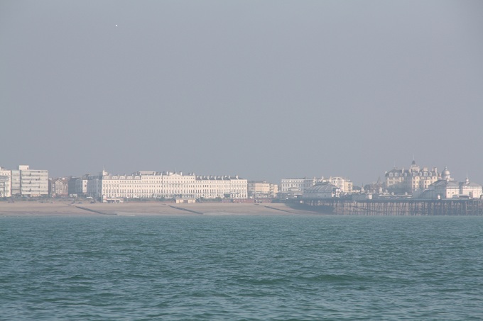 Von Weitem, diesmal von See, grüßen wir noch einmal Eastbourne, das im diesigem Sonnenlicht liegt.