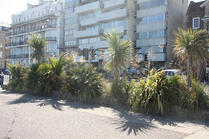 Das Wetter ist herrlich - der reine Sonnenschein bei gut 25 Grad. Wir beschließen, uns heute die Stadt Eastbourne anzusehen. Bereits im Hafengebiet bekommen wir einen Eindruck davon, nun doch bereits im Süden zu sein. Wohin wir sehen, in den Vorgärten und öffentlichen Plätzen Palmen, blühende Agaven und andere exotische Gewächse. Dabei sind wir noch gar nicht auf den Kanalinseln.