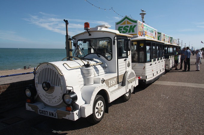Auf die Frage nach dem Weg in die Stadt. wird uns die Auskunft gegeben: gute 10 Minuten Fußweg. Wir laufen vom Hafen aus 10 Minuten und fragen, wo es nach Eastbourne entlang geht. Oh, das sind sicherlich noch 20 Minuten Fußweg. Und wir erhalten die Wegbeschreibung. Als wir freie Sicht haben, sehen wir die Stadt in sicherlich 5 Km Enfernung in der nächsten Meeresbucht liegen. Sehr schön, aber nochmals mindestens 1 Std. Fußmarsch. In dem Moment kommt eine "Eisenbahn" dahergezottelt. Auf unser Winken hält sie an und nimmt uns für 4 GBP gerne mit. Wir sind halt Touris. Alles passt.