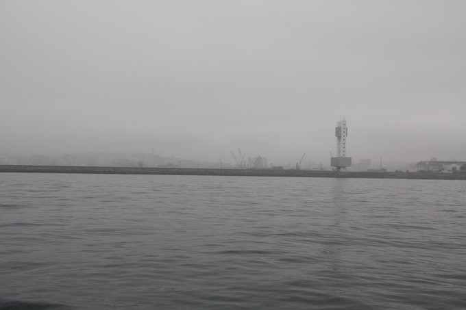 Der Segeltag ist unspektakulär. Es ist trocken. Die Küste liegt im Nebel (wie gewohnt). Da der Wind von schräg hinten (achterlich) kommt, setzen wir die Genua, die bei diesem Wind mit ihren 44 qm mehr bringt als das Großsegel mit 26 qm.; und beide zusammen ist nicht förderlich, da das Groß der Genua den Wind nimmt. Zur Unterstützung lassen wir den Motor moderat mitlaufen da wir sonst zu langsam werden. Wir wollen mindestens 4 Kn fahren. Später läßt der Wind noch mehr nach und wir rollen die Genua wieder weg, da sie nur noch schlägt und damit keinen Vortrieb erzeugt.