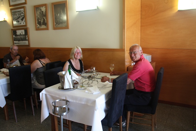 Wir bestellten eine Vorspeise (Muschelsuppe), Hauptgericht Filetfleisch und als Nachtisch Mousse au Chocolate. Man servierte uns Gambas und gebackene Krebse vorweg. Sie schmeckten vorzüglich. Wir dachten, das sei vom Haus und verzehrten mit Genuß. Tatsächlich ist es in Portugal üblich, dass das Restaurant Vorspeisen serviert die aber hinterher auf der Rechnung stehen, wenn man sie nicht zurück gehen läßt. So lernen auch wir dazu: andere Länder, andere Sitten. Mit der Flasche Wein war die Rechnung entsprechend. Aber: wir haben auf der ganzen Reise schon oft sehr gut gegessen. Dieses hier schlug in Punkto Qualität und Geschmack alles bisherige. Wir waren happy.