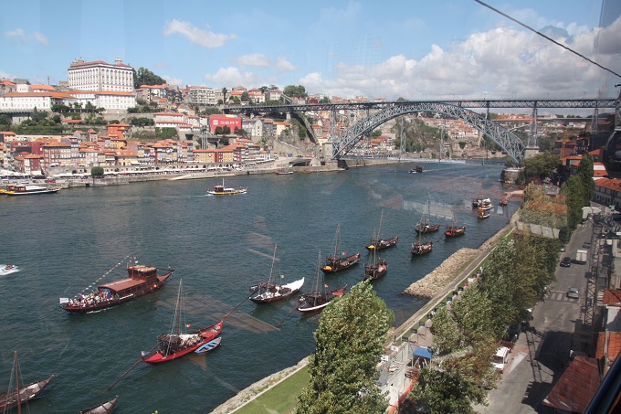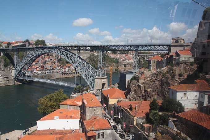 In Porto angekommen lösen wir eine Karte für eine Stadtrundfahrt. Sie berechtigt uns, 24 Stunden die Rundfahrtbusse zu benutzen. Daher können wir jederzeit für Besichtigungen aussteigen und dann wieder mit dem nächsten Bus weiterfahren. Leider ist auf dem Oberdeck kein Platz mehr frei, sodass wir wenig zu sehen bekommen. Wir verlassen daher den Bus als er die Brücke nach Gaia, das ist die Stadt, die Porto auf der anderen Seite des Douro gegenüber liegt, passiert hat. Die Brücke wurde, man erkennt es am Baustil, von einem Assistenten Eifels (Eifelturm, Paris) entworfen und gebaut.