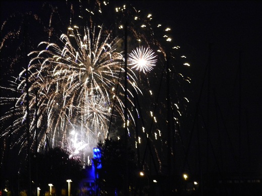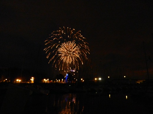 Wir gingen früh in die Koje um morgen ausgeschlafen zu sein. Aber um 22.30 Uhr weckte uns ziemlicher Krach. Wir sahen nach draußen. Dort brannte zu Ehren des ANtionalfeiertages der Franzosen ein Feuerwerk bis 23.oo Uhr ab das sehr beieindruckend war.