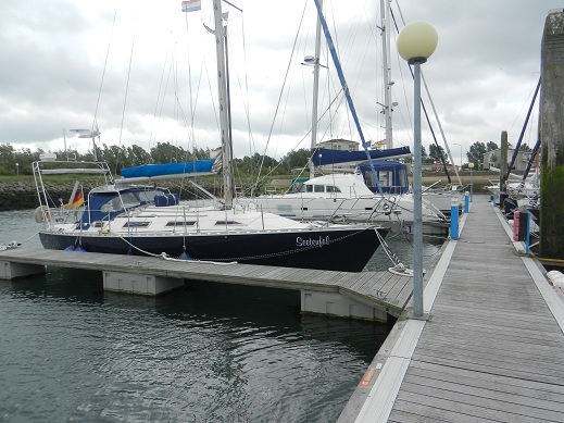Dort haben wir nicht geringeren Wind und legen mit Hilfe zweier Segler am Besucherschlengel an. Dort erfahren wir telefonisch von Hafenmeister unseren Liegeplatz. Dieser ist Gott sei Dank gegen die Windrichtung gerichtet. So gelingt uns dort der Anleger sehr gut und wir liegen sicher im Hafen. Der Wind kommt nun von vorn und bläst uns nicht von hinten in das Schiff. Sehr angenehm.