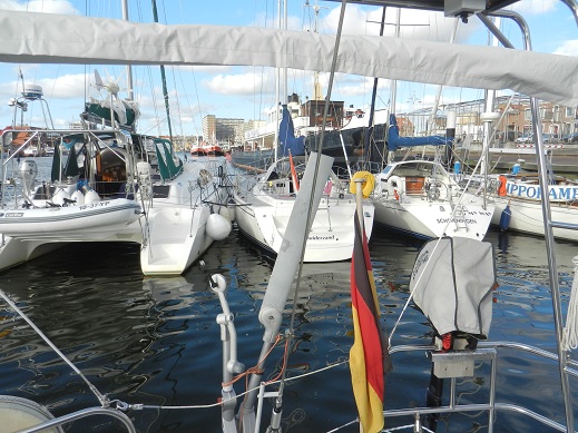 Beim Hafenmeister melden wir unseren Wunsch nach einem Liegeplatz. Beim Einlaufen wartet der Hafenmeister bereits mit einem Schlauchboot auf uns und weist uns einen Platz im Päckchen als 3. Schiff zu. Der Hafen ist voll. Wochenende, Ferienbeginn der Holländer ... Wir legen uns ins Päckchen und beschließen, morgen früh wieder auszulaufen und nach Ijmuiden weiter zu fahren. Vor uns liegt aber noch ein Päckchen mit drei Segelschiffen und zusätzlich noch einem überbreiten Katamaran.