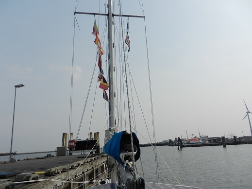 Dann holen wir mit der niederländischen die letzte Gastlandflagge herunter. Stattdessen werden nun wieder an der Steuerbordseite die Vereinsfahnen gesetzt. An der Backbordsaling können und werden wir nun die Flaggen der Länder zeigen die wir auf dieser Reiser besucht haben.