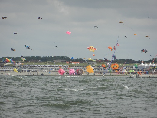 Schon nach 5 Stunden sehen wir die Insel und den Ort Norderney. Anscheinend findet ein Event mit Drachen statt. Wir genießen den Anblick aus der Ferne.