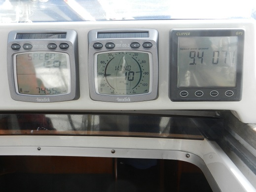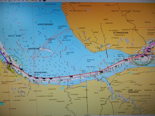Wir machen uns auf den WEg nach Brunsbütttel und staunen nicht schlecht, als unsere Logge 9,4 und dann sogar 9,6 kn Fahrt über Grund lt. GPS anzeigt. Aber durchs Wasser sind es lediglich 5,9 kn.