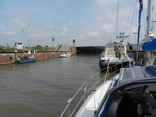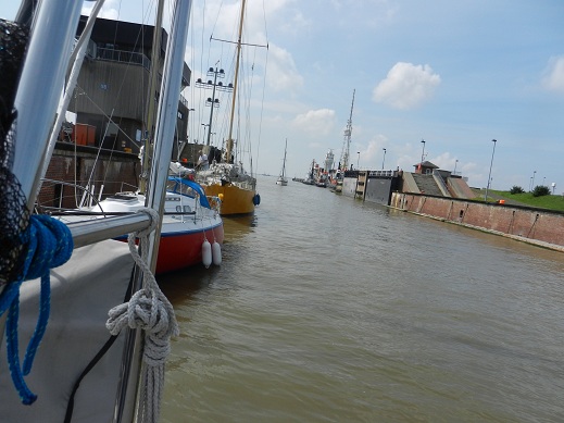 Bereits um 11.30 stehen wir vor der Schleuse Brunsbüttel. Wir warten auf ein weißes Blinklicht am Signalmast des Schleusenwärterhauses um in die Schleuse einfahren zu dürfen. Dieses erscheint bereits gegen 11.45 Uhr und um 12.15 Uhr haben wir die Schleuse passiert. Leider klappte der ANleger in der Schleuse nicht bilderbuchlike. Wir hatten nicht mit der erheblichen Strömung in der Schleuse gerechnet. Dirk konnte das Schiff daher nicht nah genug an den Anleger bringen. Andere Segler halfen uns beim Festmachen und so konnten dann endlich die Schleusentore geschlossen werden nachdem noch ein Nachzügler hereinkam.