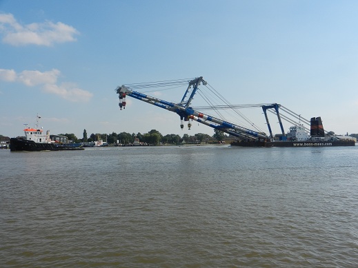 Zurück an Bord konnten wir geraqde noch beobachten wie dieses Ungetüm geschleust und vom Schlepper gezogen wurde. Dieses Schiff ist mit einem extrem starken, tragfähigem Krahn bestückt. Er soll 1.500 Tonnen heben können....